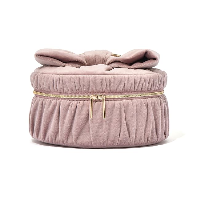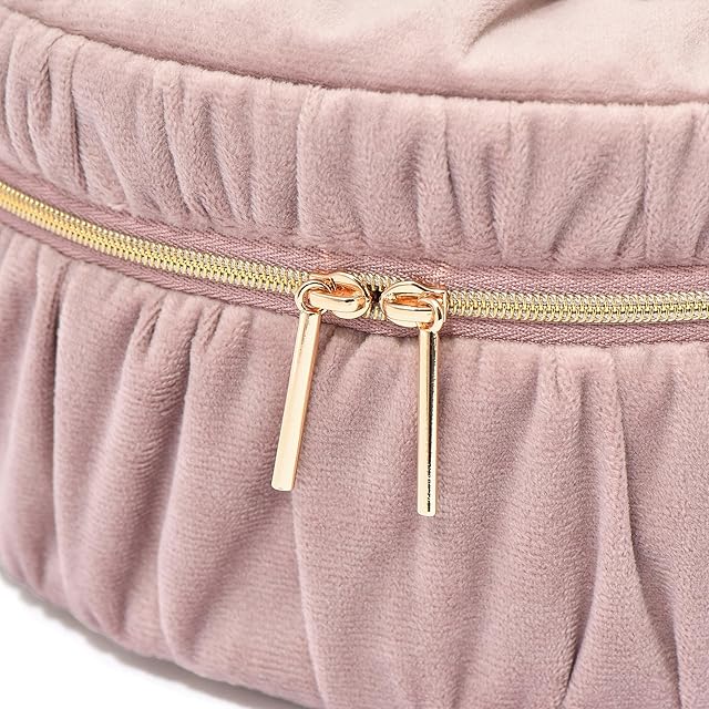 光沢感のあるベロア生地で大きなリボンをあしらったポーチです。<br>可愛らしいリボンモチーフと落ち着いた配色のバランスが絶妙で、普段使いに取り入れやすいデザイン。<br>バニティポーチはキュートな円形に仕上げ、ゴールドのハンドルで高級感をプラスしました。<br>ご自宅で毎日のメイク用品を収納しておくのに最適なサイズです。<br>中央には取り外しが可能な仕切りも付いていて機能性抜群。<br>ブラシの取り出しやすさにもこだわりました。<br>随所に使いやすさの詰まった名品です。
