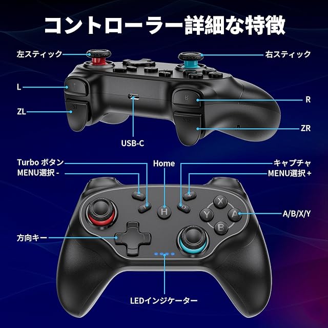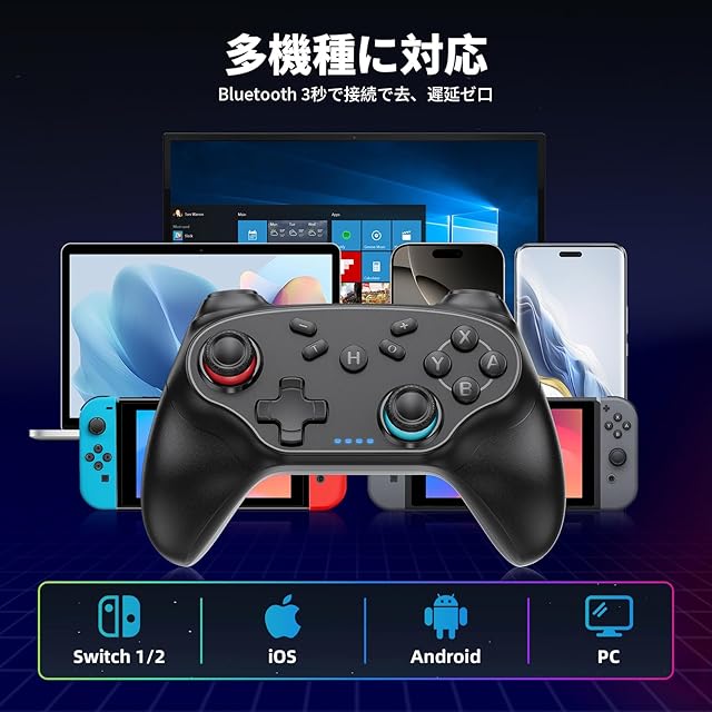 【Switch コントローラー プロコン 互換】互換 Switch コントローラーはSwitch全世代(Switch2代も含まれる)、Android/IOS(IOS16.0以上)/PC Windows7/8/10/11などに対応します。ワイヤレスBluetoothを採用し、接続は速く安定で遅延ゼロです。10m内で100%安定性ができます。それに加えて、付属のUSBケーブルを使って接続できます。日本ユーザー向けにABXYボタン配置を純正同様に最適化。お子様からプロゲーマーまで、すべてのプレイヤーにおすすめ。プレゼントにも最適なプロコン。