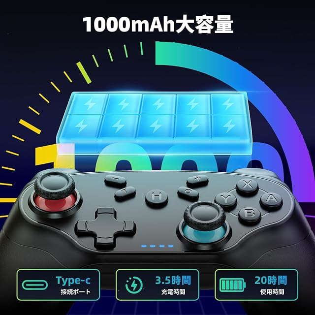【大容量バッテリー】1000mAhの大容量バッテリーが搭載し、Type-C急速充電ケーブルも付属して、一回フル充電すると、16-20時間連続使用可能です。このバーションのゲームプロコンのボタンの耐用性もアップさせました。500万回動作テスト通過(耐久性10倍)、素晴らしい触覚フィードバックがされ、最大限の快適なゲーム体験が得られます。