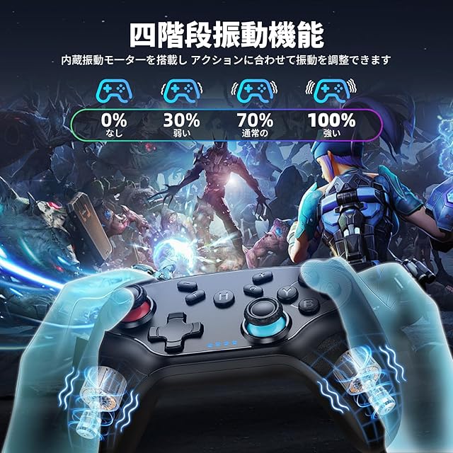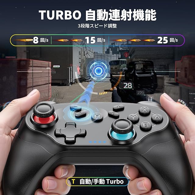 【Turbo連射機能&4段HD振動機能】互換 Switch1/2代コントローラーはTURBO連射機能を搭載し、ゲームに応じて連射機能(8回/秒、15回/秒、25回/秒)を設定できます。その他、自動連射機能もあり、一回押すだけで圧倒的な攻撃ができ、勝率を上げることができる!互換 switch2 プロコンは内蔵振動モーターを搭載し、4段階振動調整機能(0%/30%/70%/100%)を提供され、アクションに合わせて振動を調整することができます。