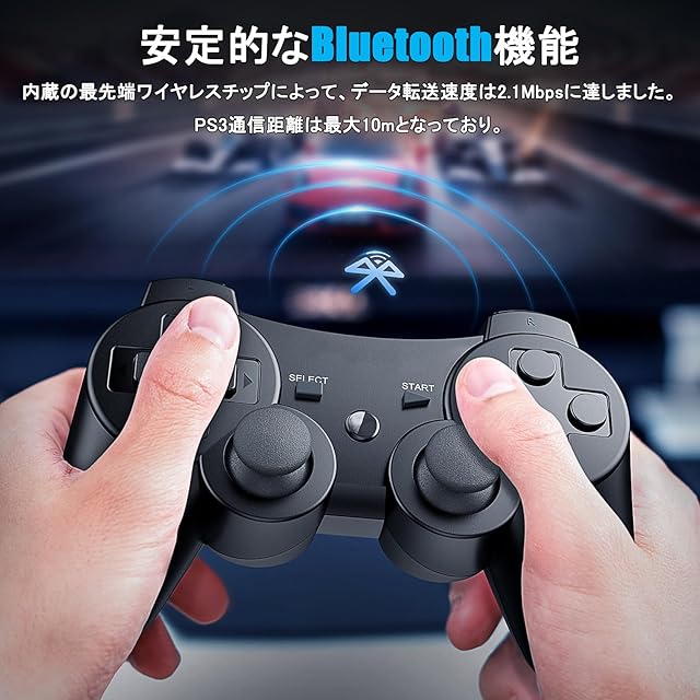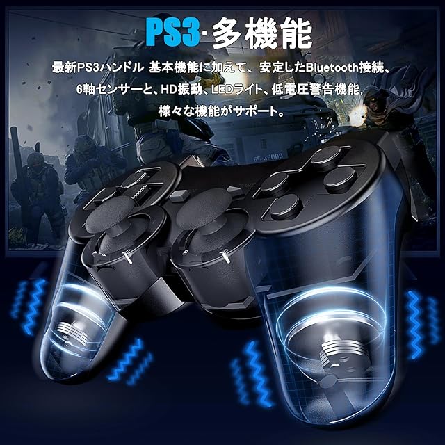 【安定的なBluetooth機能】内蔵の最先端ワイヤレスチップによって、データ転送速度は2.1Mbpsに達しました。PS3通信距離は最大10mとなっており。無線コントローラーなので、500mAh大容量の充電式バッテリーが搭載されており、2~3時間あればフル充電します。有線繋ぐの限制から解放します、自由的に操作することができます。USBインターフェースの高速充電。一回フル充電すれば、10時間以上連続でゲームすることができます。USBケーブルが不要なので操作の自由度が高く、遅延がなく、ゲームをスッキリプレイできます。週末のチームビルディングであろうと家族の夕食であろうと、友人や家族と緊密に交流することができます。推奨事項:製品を受け取った後、接続する前に充電してください。回避:コントローラーはスタンバイ状態になり、使用できなくなります。これはゲームエクスペリエンスに影響します。