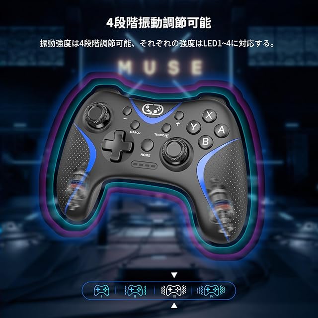 【マクロ機能&4段階HD振動】後ろにはプログラミング機能ボタン(M1とM2)を追加、マクロボタンと同時に押して、プログラミングモードに入ります。マクロボタンは各機能ボタン(A/B/X/Y/L1/L2/R1/R2上/下/左/右ボタン)とマッピングでき、一つのプログラムに最大16個キー入力可能。一連のキー操作をひとつのボタンに割り当てることが可能で、ゲーム中によく使う複数の連続する操作や必殺技などの登録には便利です。特に格闘ゲームにおいては、1つの技を出すために複数のキー入力が必要なため、1つのボタン操作で技を繰り出せるプログラム編集機能は便利です。4段階HD振動機能を備え、体感型ゲームをやる時、しっかりと振動が手に伝わり、ゲームの臨場感が溢れます。L1+L2+R1+R2を同時に5秒間長押しして、振動強度(強→中→弱→無し)を調整可能。振動機能をOFFしたいときは、振動無しモードに調節し、あるいはSwitchのHOMEメニューの「設定」から、「コントローラーとセンサー」→「コントローラーの振動」をOFFにする。