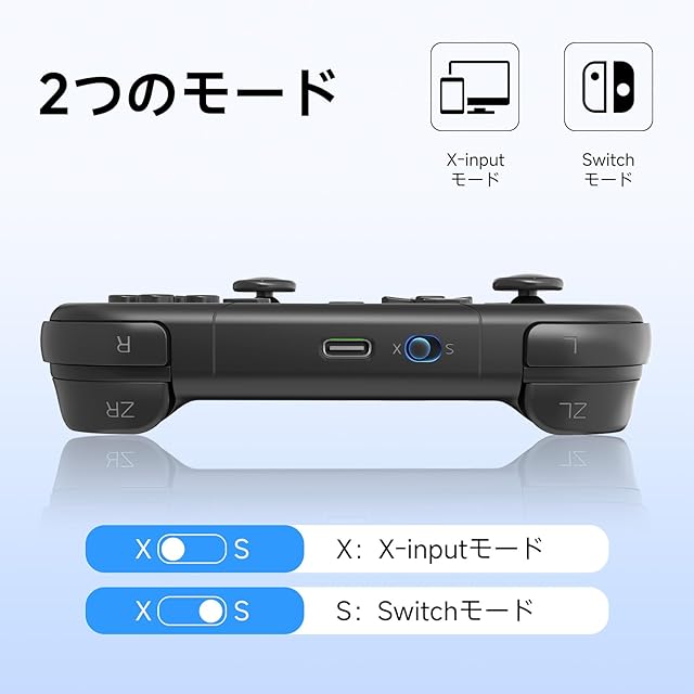 『対応機種』本製品はSwitch2・Switch・Lite・OLED・PC・SteamDeck・iOS・Android対応のワイヤレスコントローラーです。2つのモード(X-inputモード / Switchモード)を搭載し、「A/B」ボタンと「X/Y」ボタンの出力値を自由に入れ替え可能です。お好みに合わせて、レイアウトを素早く切り替えられます。