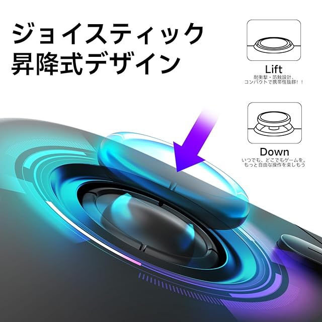 『スマホより小さく、携帯性抜群!』サイズ:12×6.5×3cm、スマホよりもコンパクトで、高い携帯性を実現します。ジョイスティックは昇降式デザインを採用しているため、持ち運び時に誤って押しつぶしてしまう心配がなく、安心です。