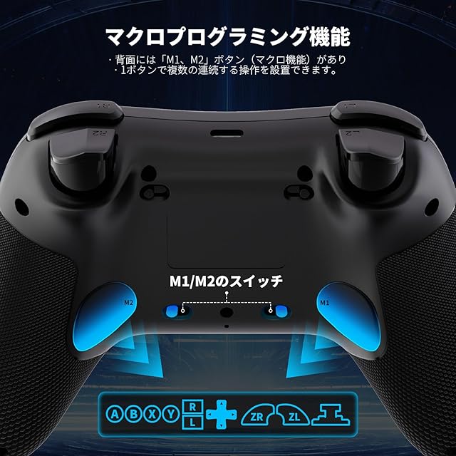 『多種多様な機能』本製品には複数の機能があり、ゲームに応じて自由に設定できます。①振動調整:4つの振動強度あり:100%、80%、50%、0% デフォルトは100%です。②Turbo連射:半自動と全自動モードあり、Turbo速度も5回/S→12回/S→20回/Sが調整でき、デフォルトは12回/Sです。③6軸ジャイロセンサー機能:よりゲームに没頭できます。④マクロ機能:背面のM1/M2にはスイッチがあり、プログラミング機能を使用しない際に誤操作を防ぐことができます。⑤低電力警告:バッテリー残量が10%以下になると、ライトが点滅して低電力を示します。⑥ゲーム中の連打、誤操作を防止するため、方向ボタンの斜め方向をオフにする機能が設置できます。