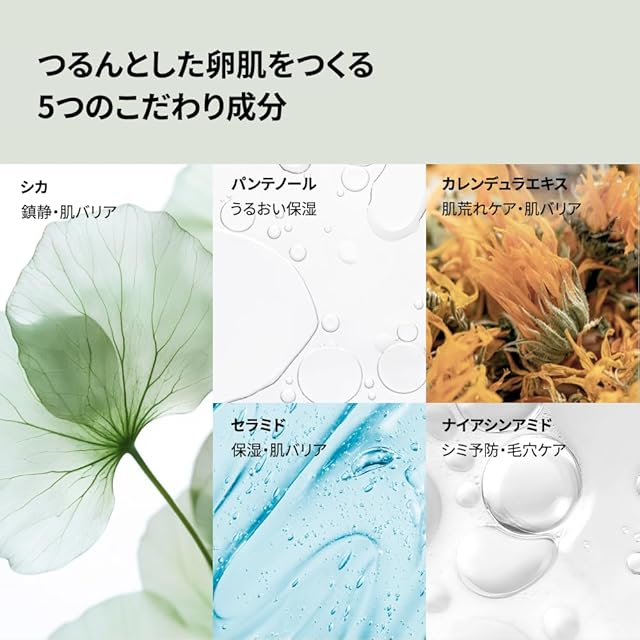 【シカ×ナイアシンアミド配合|敏感肌にもやさしい処方】 ツボクサエキス(CICA)、ナイアシンアミド、セラミド、パンテノール、カレンデュラエキスなどの 美容成分が、肌のうるおいを守りながらバリア機能をサポート。