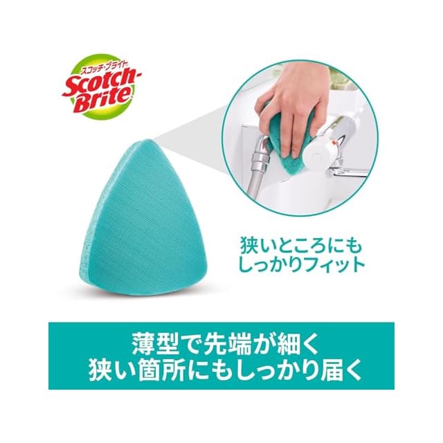【狭いすき間もお任せ!薄型で細かい箇所もキレイに】 先端が細い三角スポンジ。手のひらサイズで扱いやすく、狭いところにもしっかりフィットし、隙間や蛇口まわりの細かいところもしっかりお掃除できます。