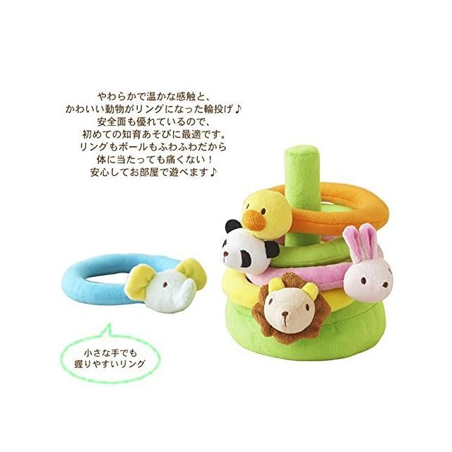 ライオン、ぞう、パンダ、ひよこ、うさぎ、5匹の動物がリングになったわなげです。