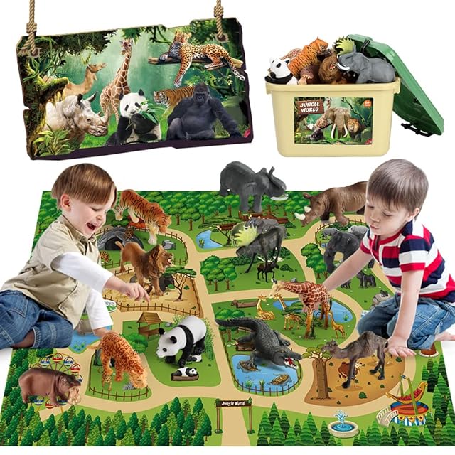 幅広い用途に対応-すべての動物のおもちゃとプレイマットは、取っ手付きの丈夫な収納プラスチックボックスに一緒に収納されています整理整頓されています。誕生日パーティーの記念品、クリスマス、ホリデーまたはインパルスギフト、風景のシーン、想像力豊かな遊び、コレクション、森林のベビーシャワーパーティーのテーマの装飾などに最適です。家で、屋外で、または学校での教育ツールとして遊ぶのに便利です。