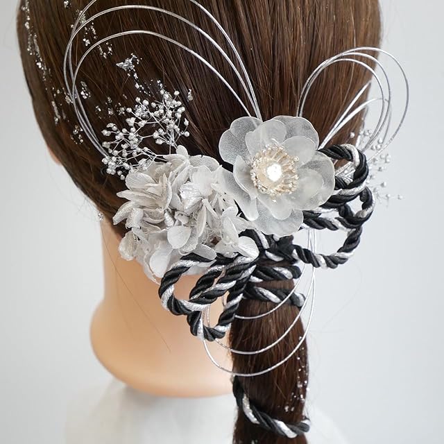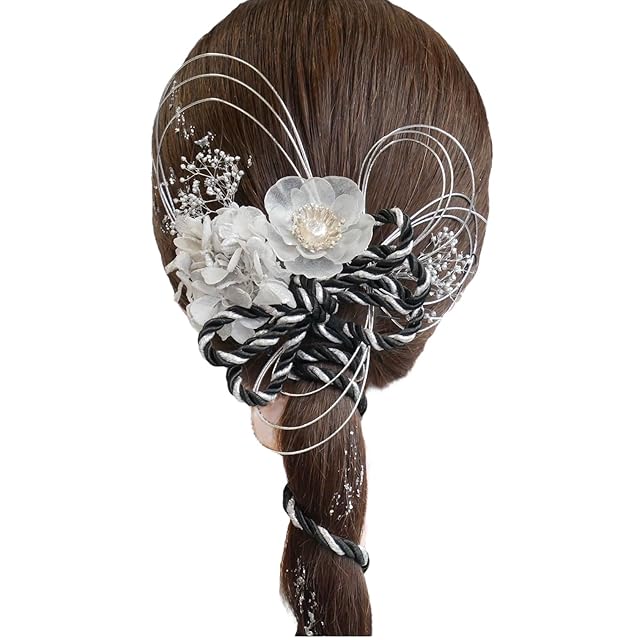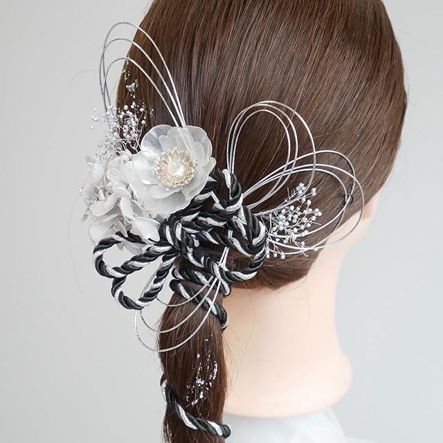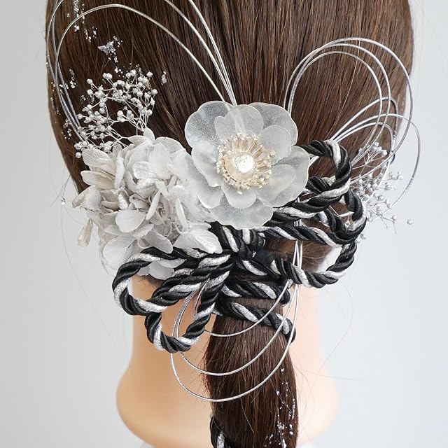 [Lomeri ロメリ] 組紐とドライフラワーの髪飾り ゴールド ポニーテール 髪飾り 成人式 卒業式 振袖 結婚式 和装 F11 (黒×シルバー)