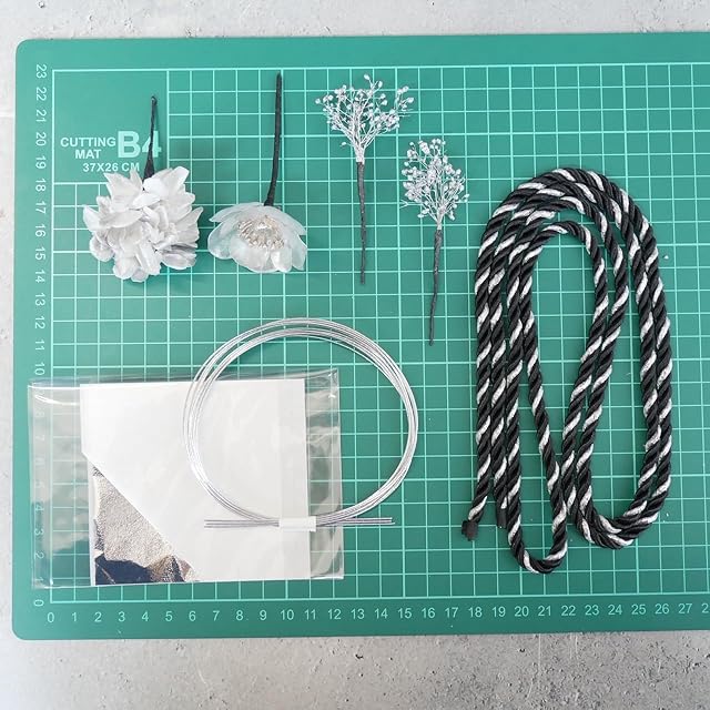 パーツ詳細 組紐 約130cm ドライフラワー 3パーツ クリアフラワー 1パーツ 水引(シルバー3本) 銀箔