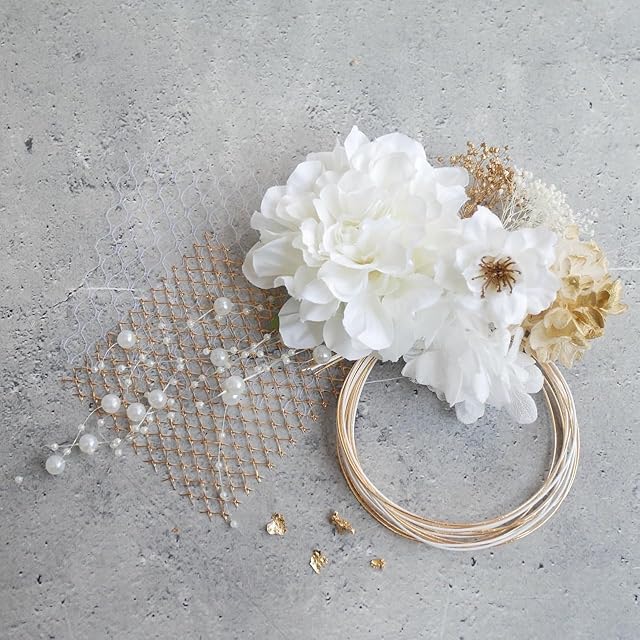 パーツ詳細アートフラワー2パーツ、ドライフラワー 4パーツ、パールチェーン、水引 ブロンズ3本 白 2本 約90cm、ゴールドネット、白ネット、ブロンズ箔