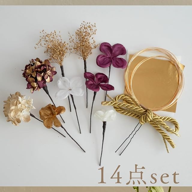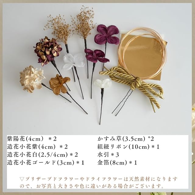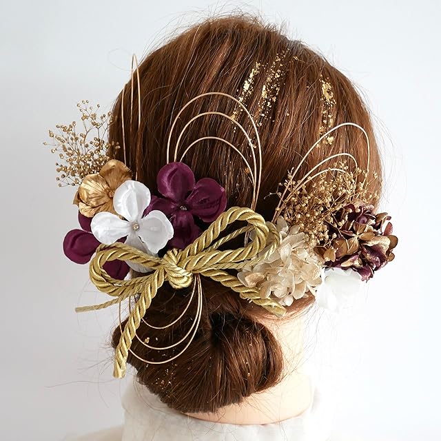 和装着物やウェディング、 成人式の振袖や卒業式の袴、結婚式や七五三まで幅広くご利用いただけます。 全て1本1本ピックタイプでお作りしておりますので お好きなデザインでヘアアレンジしていただけます。 素材は、造花とドライフラワーやプリザーブドフラワーをmixした髪飾りです