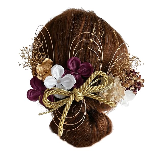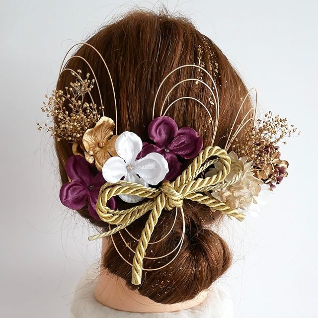 [Bria]成人式 卒業式 結婚式 七五三 和装 プリザーブドフラワー髪飾り 組紐水引金箔付き 6色展開 (紫)