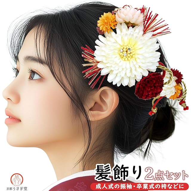髪飾り 2点セット 振袖 成人式 wk-335 菊 水引 白 赤