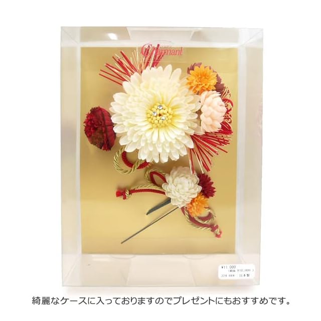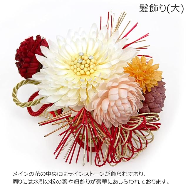 ラインストーンが綺麗で可愛い!<br> お振袖や袴に合わせていただける豪華な髪飾り、2点セットです。<br> <br> <おすすめポイント><br> 真っ白の大きなお花を中心に、金や赤色の水引や紐飾りが豪華に飾られております<br> メインのお花の中心にはラインストーンがあしらわれておりキラキラと光ります。<br> 和装にぴったりのデザインですので流行に左右されず、振袖や袴、浴衣などの和装おすすめです。<br> 古典柄のお振袖やモダン系のお振袖まで広くご使用頂けます。<br> 綺麗なお箱に入っておりますので贈り物にもおすすめです。<br> お嬢様やお孫様へのプレゼントにいかがでしょうか? <br> <br> ◇飾り部分の大きさ<br> (大)よこ約11cm たて10.5cm<br> (小) よこ約4.5cm たて3.5cm<br><br> ◇コーム・ピン<br> (大・コーム)幅:約5.5cm 長さ:約3.5cm<br> (小・ピン)長さ:約7cm<br>