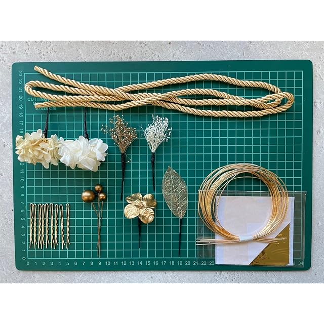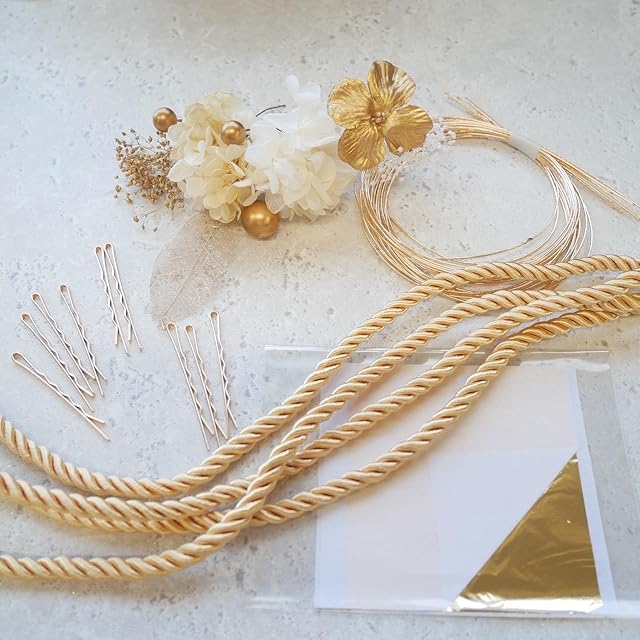 水引と金箔シート、ゴールドピン、 ドライフラワーや組紐ロープも入ったセットです。