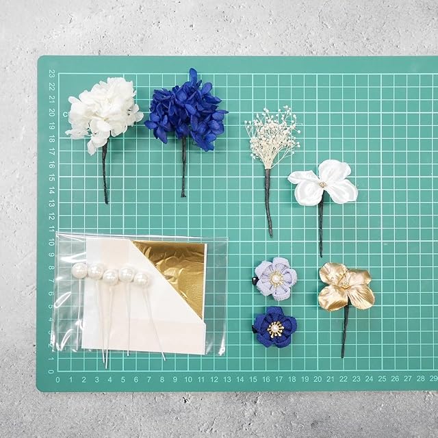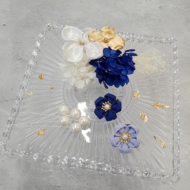 パーツ詳細つまみ細工2パーツ、ドライフラワー 3パーツ、アートフラワー(造花) 2パーツ、パールピック、ブロンズ箔