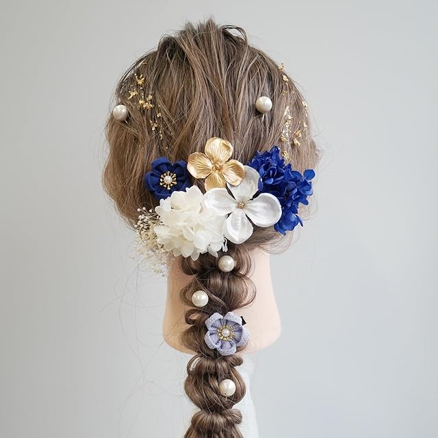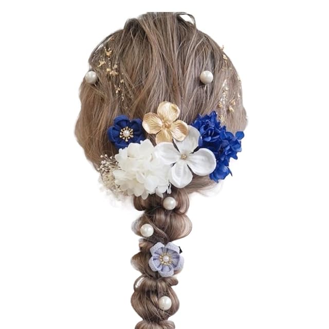 Lomeri ロメリ【6色展開】髪飾り つまみ細工 ちりめん 成人式 卒業式 結婚式 振袖(白ゴールド)N23 (ブルー)