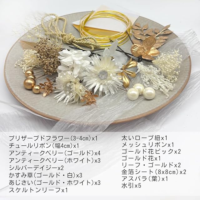 【セット内容】プリザーブドフラワー、あじさい、ゴールドリーフ、ゴールド花、ロープ、チュールリボン、ゴールド花ピック、かすみ草、ベリー、スケルトンリーフ、シルバーデイジー、リモニウム、メッシュリボン、ミックス水引、金箔シート。セット内容は6枚目の画像をご参照ください。