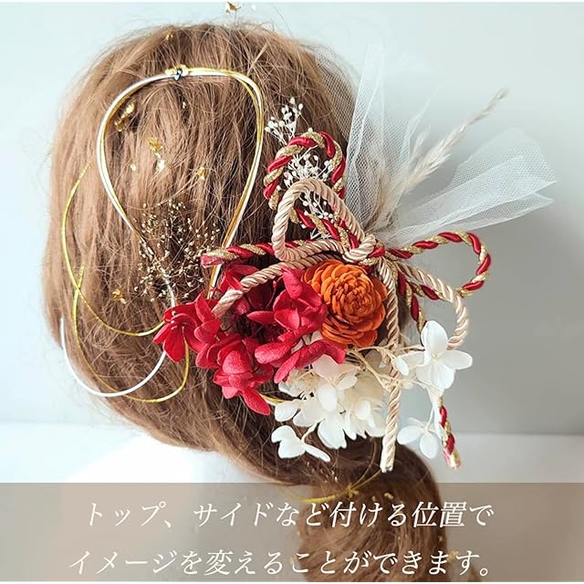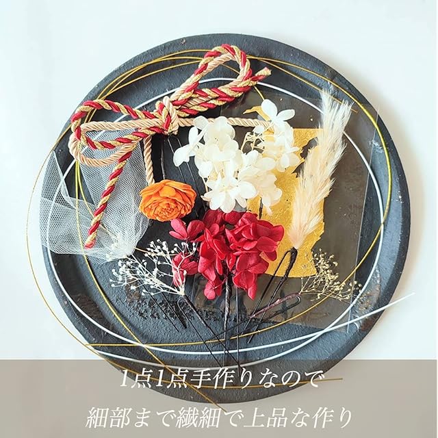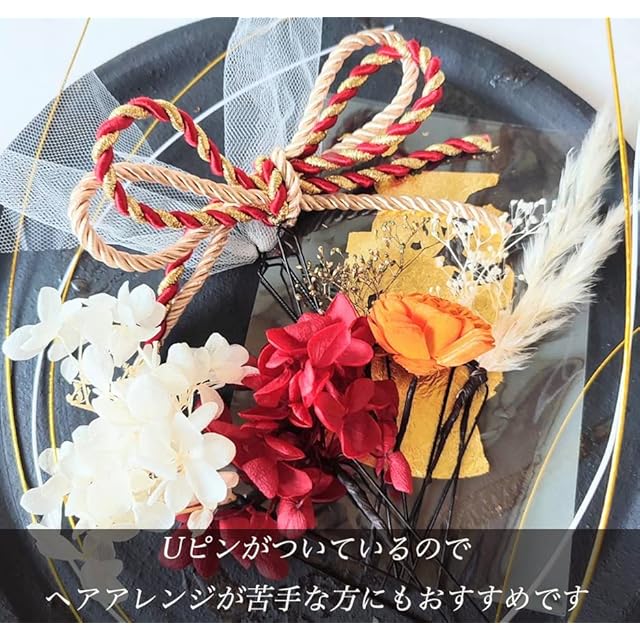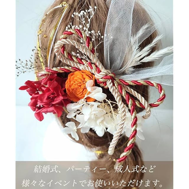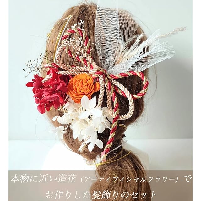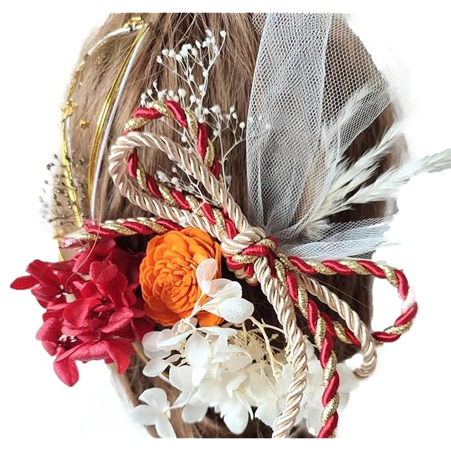本物に近い造花(アーティフィシャルフラワー)でお作りした紫陽花(あじさい)をモチーフにした髪飾りのセットです。<br> 一点一点手作りのハンドメイドなので、細部まで繊細で上品な作り。<br>お花にも存在感がありとっても華やかにお召しいただけます。<br> Uピンで留められるので角度も変えやすくアップスタイル、ダウンスタイルなど様々なヘアアレンジに対応できます。トップ、サイド、シニヨンなど付ける位置を変えることでイメージを変えることができます。挙式と披露宴で イメージを変えたい方にもぴったりです。<br> 結婚式、披露宴、ブライダルはもちろん、成人式、和装前撮り、卒業式、七五三、お正月、ひな祭り、など様々なイベントでお使いいただけます。<br> 内容 :赤紫陽花プリザーブドフラワー 1点,白紫陽花プリザーブドフラワー 1点,ゴールドカスミソウプリザーブドフラワー1点,白カスミソウプリザーブドフラワー1点,オレンジドライフラワー1点,パンパス ドライフラワー1点,水引(ゴールド・白)3本/白チュール 1点,金箔 1点,組紐 赤ゴールド1点<br>