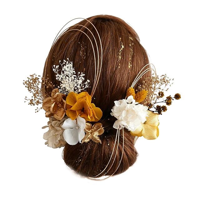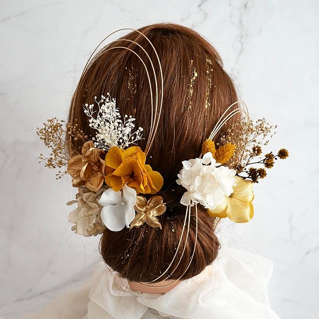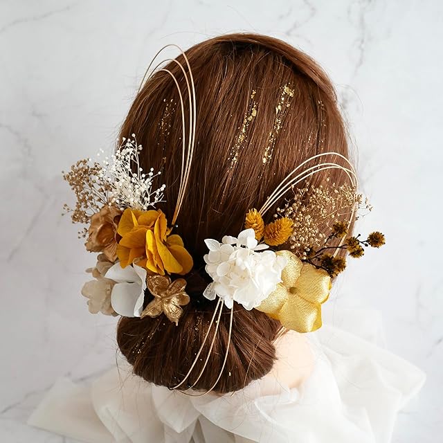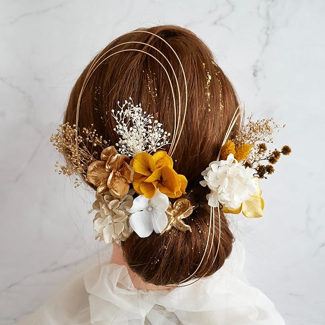 成人式 卒業式 結婚式 七五三 和装 ドライフラワー プリザーブドフラワー髪飾り 金箔付き 4色展開 水引 紫陽花 (黄色)