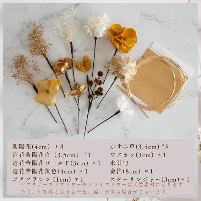 商品名:成人式 卒業式 結婚式 七五三 和装 ドライフラワー プリザーブドフラワー髪飾り 金箔付き 4色展開 水引 紫陽花 (黄色)