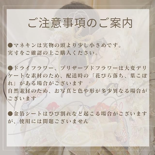 ドライフラワー、プリザーブドフラワーは大変デリケートです。配送時の「花びら落ち、葉こぼれ」、自然素材のため「穴あきや虫食いあと」等ある場合もございます。また、お写真と大きさや色に違いがある場合がございます。