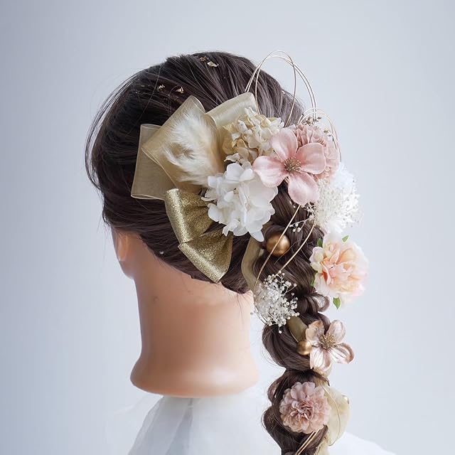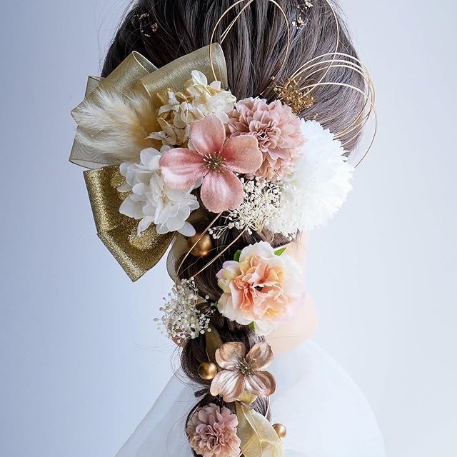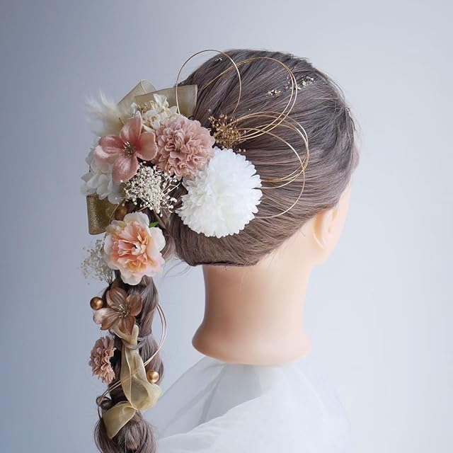 新作のフリルローズに、人気のオーガンジーリボンとマム、ドライフラワーを組み合わせた髪飾りセット。 リボンと水引を色々な付け方でアレンジできます。