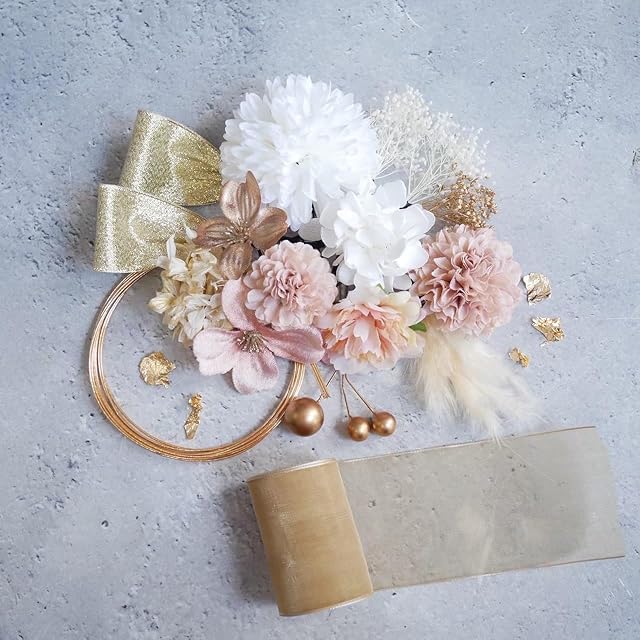 パーツ詳細 ドライフラワー 6パーツ アートフラワー(造花) 6パーツ オーガンジーリボン 約80cm 1本 リボンピック 2パーツ ゴールドパール(3本セット) ブロンズ箔 シート 水引ブロンズ3本 (水引はご自由にアレンジいただけます)