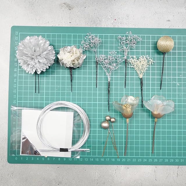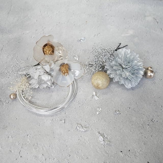 パーツ詳細水引 シルバー4本 白3本(約90センチ)、ドライフラワー5パーツ、マム 1パーツ、クリア椿2パーツ、ブロンズパール、和玉小 ブロンズ、シルバー箔シート