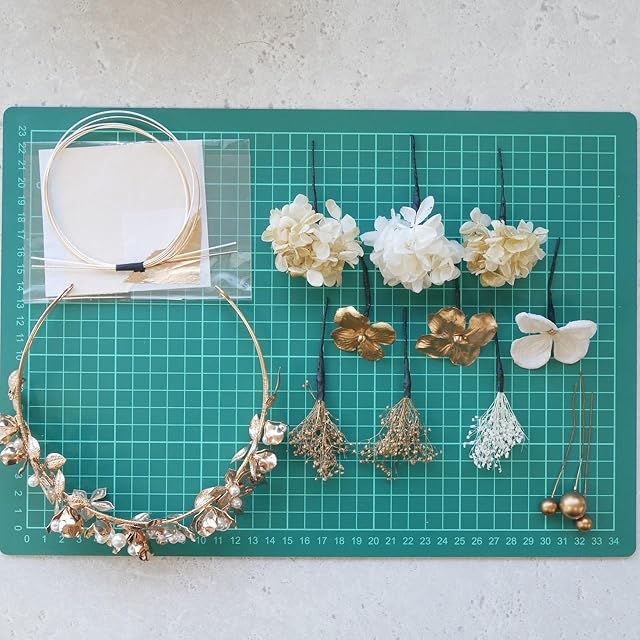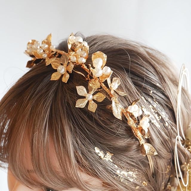 リーフとお花にパールがたくさんついた華やかなデザインのカチューシャと、 ゴールド、白系のパーツをセットにした髪飾りです