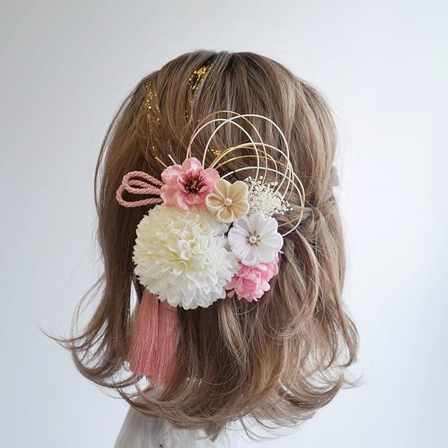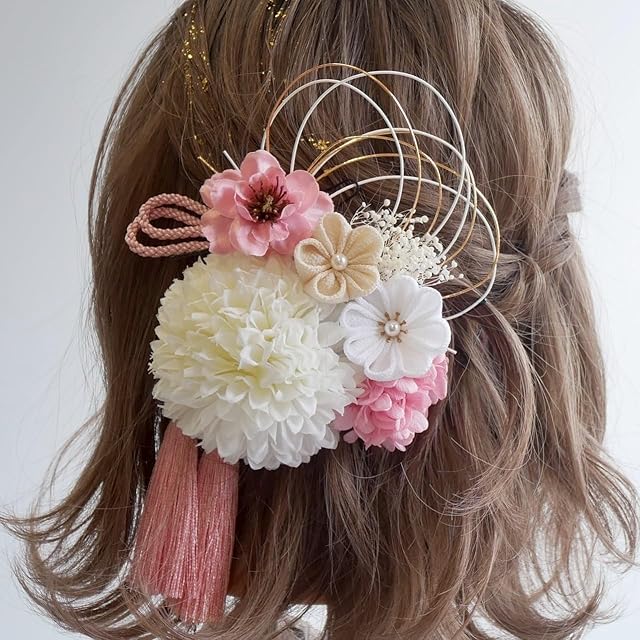 商品名:[Lomeri] ロメリ 白 つまみ細工 髪飾り 卒業式 袴 結婚式 水引 かすみ草 和玉 成人式 T2 (ピンク)
