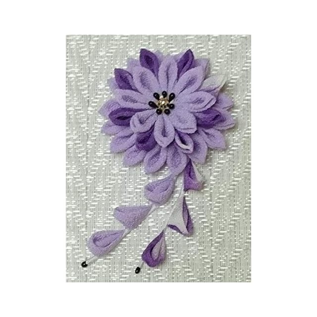 一越ちりめんを使ってつまみ細工のブローチを作る手芸キットです。細やかな手仕事で優雅なコサージュタイプのブローチが仕上がります。立体的なお花の部分は観賞用で有名な「美濃菊」をイメージして、人気の藤下がりを付けました。花の直径は約7㎝。全長は約14㎝。優しい藤色で大人のアクセサリーを作りましょう。製作に必要な材料一式と作り方説明書をパックした袋入りの商品です。