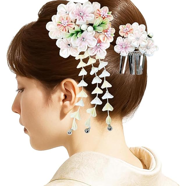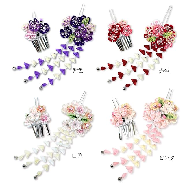 <おすすめポイント><br> ・お振袖用の高級髪飾りです。<br> ・伝統工芸のつまみ細工で仕上げた豪華なお品物です。<br> ・商品は髪飾りの「大」と「小」のセットになっています。<br> ・和の雰囲気で上質感がありとても高級感がございます。<br> ・流行に左右されないので長く使っていただけます<br> ・箱入りなのでプレゼントにもおすすめです。<br> <br> <br> [用途] 〇成人式や卒業式、結婚式のお振袖に<br> 〇袴姿のコーディネートに<br> 〇七五三のお参りに<br> <br> [カラー]<br> 4色‥赤色・紫色・白色・ピンク<br> ※ご購入の際お好みの色を選択してください。<br> <br> [サイズ]<br> ◇ 花飾り部分 大きさ: (大)約8cm (小)約7cm<BR> 藤下がり 長さ:約15cm(鈴を含む)<br> ◇ かんざし金具 長さ: (大)9.5cm (小)7.5cm<br>