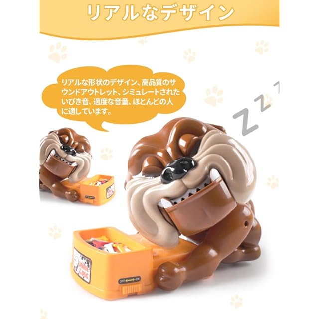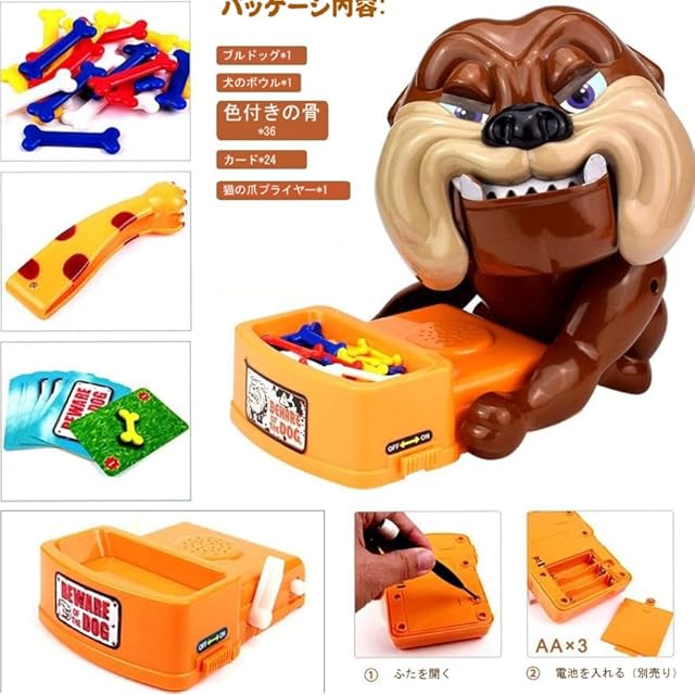 使用方法 1.ドッグの体を押した後、犬が睡眠の状態に見えるために、犬の頭を右に回します。 2.多くの色の骨を犬のボウルに入れて、よく混ぜて、その後電源スイッチを右にプッシュして、電源をオンにします。 3.ゲームカードを乱させて、ゲームのプレーヤーたちに配ります。 4.カードの色と数字により、犬のボウルから相応の色と数の骨を取り出してください。 5.骨を取り出す時に、犬が起こされば、犬が突然立ち上がって、ひどい音になり、犬に突然襲われる可能性があります。 6.ゲームのプレーヤー人数やルールは参加者たち自分で決まります。より面白いゲームができるかもしれません。