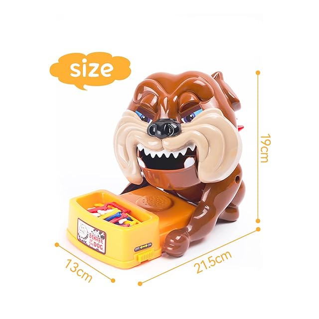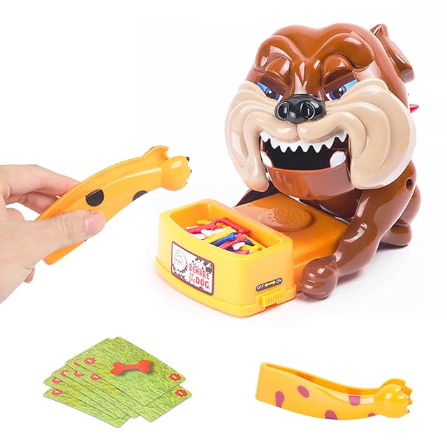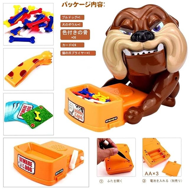 【ゲームプレイ】 起こすと、怒ったブルドッグが自発的に飛び起きて激しく吠えます。 カードを混ぜ合わせ、犬の前のボウルに入れます。プレイヤーはカードを選択し、クリップを使用して対応する骨を犬のボウルから取り除きます。犬の鳴き声も聞こえます。これは非常に刺激的で興味深いものです。