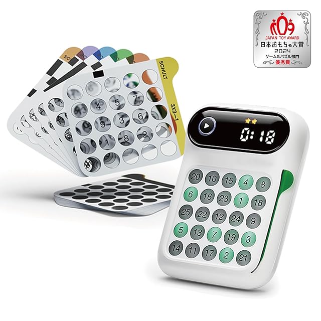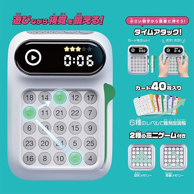 ポチっと脳トレ!老若男女が遊び感覚で脳を鍛えられる脳トレトイ!いつでもどこでも楽しく集中力や注意力、記憶力を鍛えられるコンパクトサイズゲーム!視線をボードの中央に集中させることで、周辺視野を広げるトレーニングにも!<br>●ボタンの音と感触がたまらない!何度もトライしたくなる!ミスなく全てのボタンを押せた時の達成感がすごい!●3つのモードで飽きさせない!遊び方は超簡単!<br>①早押しモード:カードを挿入してスタートボタンを押し、数字が小さいものから順にボタンを押す!早さを競うタイムアタック!②順番メモリーモード:スタートボタンを押し、点滅するライトの順番と位置を記憶して再現する。3回間違えると失敗!③図形メモリーモード:スタートボタンを押し、ボタンが点灯した全ての位置を記憶して再現する。3回間違えると失敗!