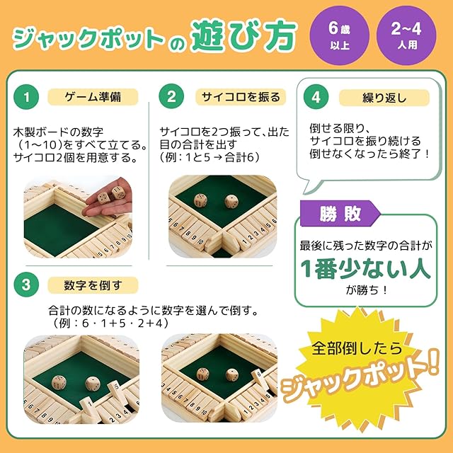 【ジャックポット】ジャックポットは、2~4人で遊べるシンプルなサイコロを使った、ボードゲームです。呼び名はジャックポット(JACKPOT)やシャット・ザ・ボックス(Shut The Box)など国によって呼び名が変わります。