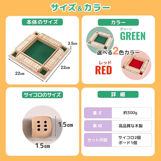 【遊び方】①サイコロを2個振ります。②サイコロの出目のタイルを倒す。③タイルを倒せなくなったら人は終了。④残っているタイルの数字が少ない人が勝ち。(例.①サイコロの目が4と5。②4か5か、合計値の9が倒せます。③交互にサイコロを振り、タイルを倒す、倒せなくなった人からたら終了。④残った数字を、左から順に並べた数字を得点とするルールや、残タイルを足した数字を得点とするルールがあります)