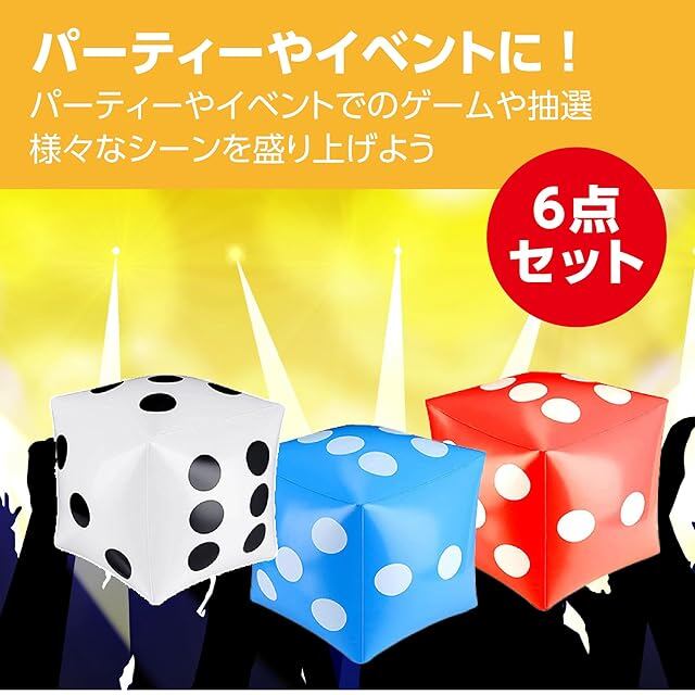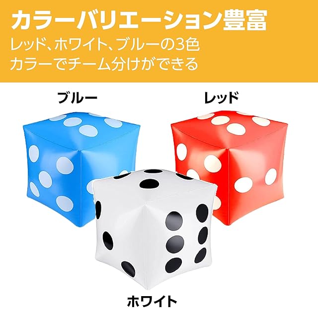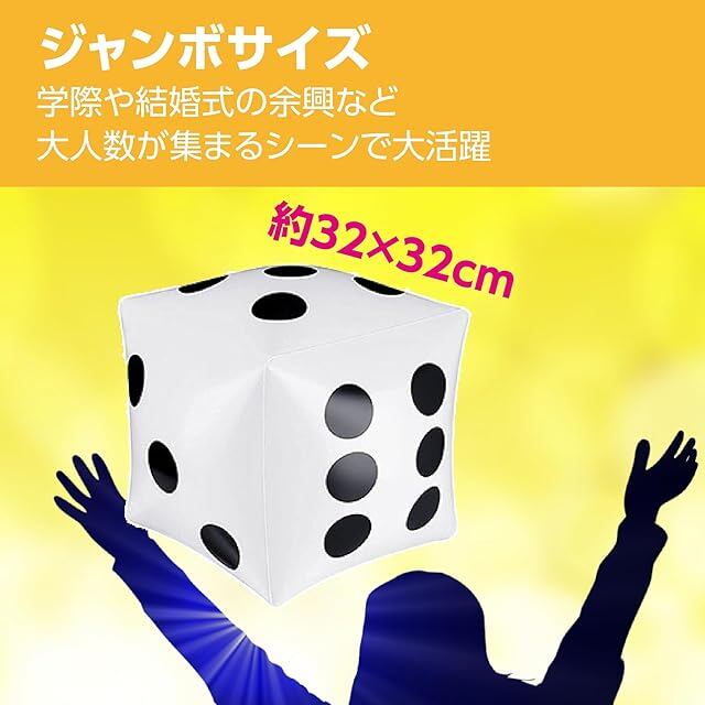 パーティーやイベントでのゲームなどに:ビッグサイズのジャンボサイコロで、パーティーやイベントでのゲームや抽選など、様々な用途でお使いいただけます。空気で膨らませるタイプなので、持ち運びや保管もしやすいです。