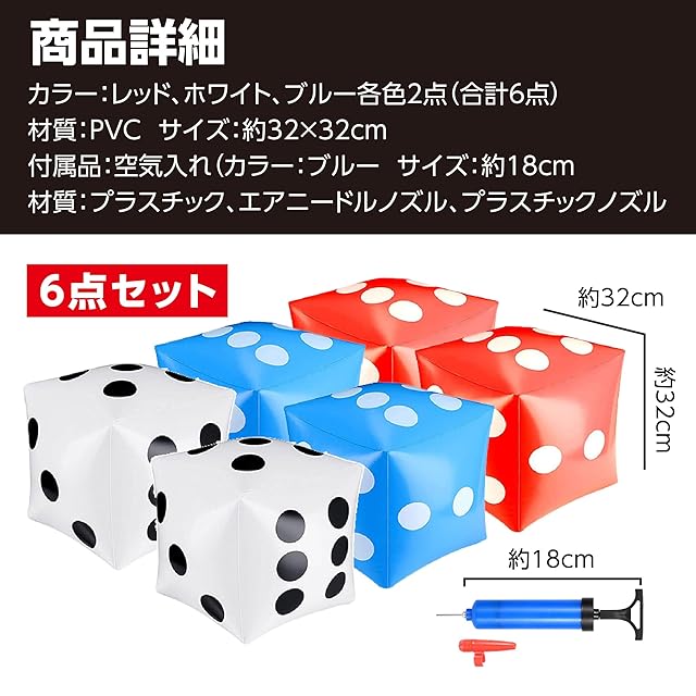 パーティーやイベントでのゲームなどに:ビッグサイズのジャンボサイコロで、パーティーやイベントでのゲームや抽選など、様々な用途でお使いいただけます。空気で膨らませるタイプなので、持ち運びや保管もしやすいです。<br><br>運動会や文化祭などでの使用も:3色のジャンボサイコロが2点ずつ揃ったセットなので、運動会や文化祭、パーティーゲーム、二次会、抽選イベントなど大人数が集まるイベントでもお使いいただけます。<br><br>空気入れが付属:こちらのセットには、サイコロに空気を充填するための空気入れ、エアニードルノズル、プラスチックノズルの3点が付属しています。直接口を付けずにサイコロに空気を充填できるので、衛生的です。<br><br>使わない時は空気を抜いて収納できる:こちらのジャンボサイコロは空気を充填するタイプなので、使わない時は空気を抜いてコンパクトな状態で収納できます。イベントシーンなどで幅広く活躍してくれるジャンボサイコロです。<br><br>セット内容:6個セット(各色×2個) 材質:PVC サイズ:約32×32cm 付属品:空気入れ(サイズ:約18cm 材質:プラスチック)、エアニードルノズル、プラスチックノズル ※モニターの環境等により、色の見え方に若干差が生じる場合がございます。