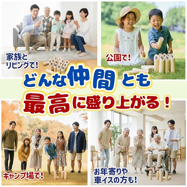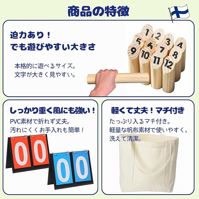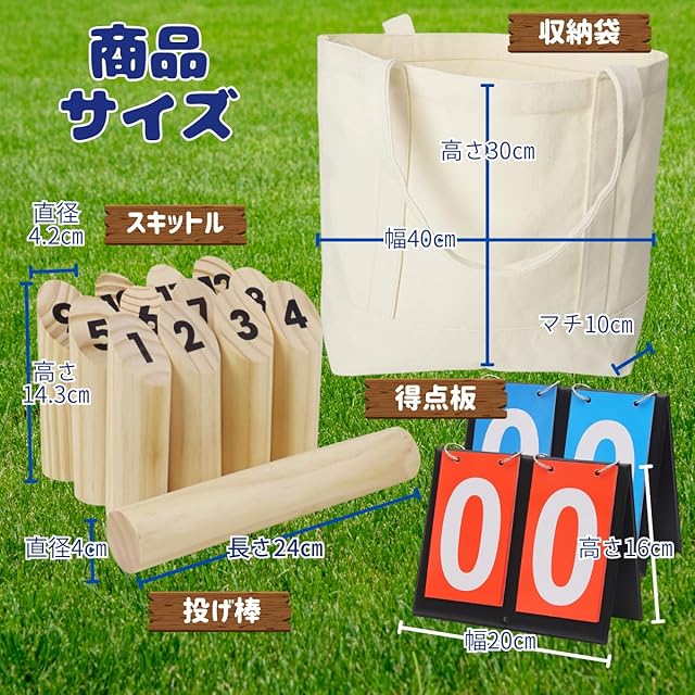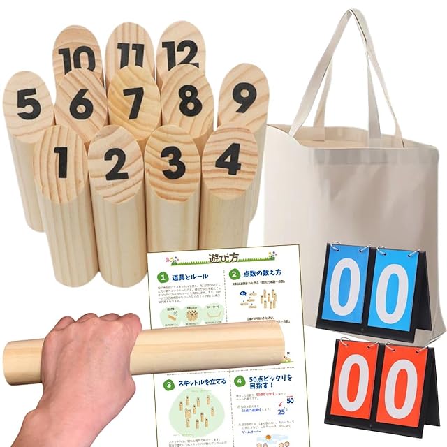 セットには得点板と収納袋も付属。到着後すぐにゲームを始められ、移動や収納にも便利です。 <セット内容> スキットル ×12 投げ棒 ×1 得点板 ×1 収納袋 ×1 遊び方説明書(日本語)