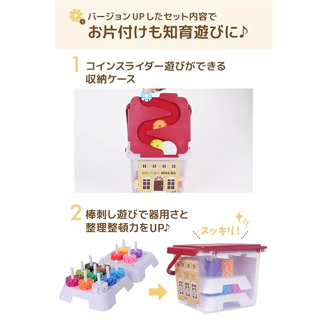 【セット内容】 1.贈り物にも最適なシンプルな外箱 / 2.コインスライダー付きおうち型ケース(QRコード読み取り式動画説明書付属) / 3.棒さし遊び用土台×2個 / 4.棒さし遊び用のピン×18本 / 5.ひも通し遊び用×13カラー。お片付けや整理整頓も楽しみながら身につきます。