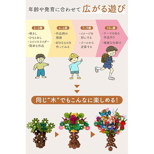 【年齢や成長に合わせた遊び方】2~3歳:色の概念や神経系の発達を促す遊び。4?5歳:平面的な作品で構成力を向上。6?7歳:立体的な作品で空間把握能力と想像力を伸ばす。8?12歳:グループワークでルールに沿った作品作りが楽しめます。お子様の年齢や成長に合わせた夢中になれる遊びが盛りだくさんです。