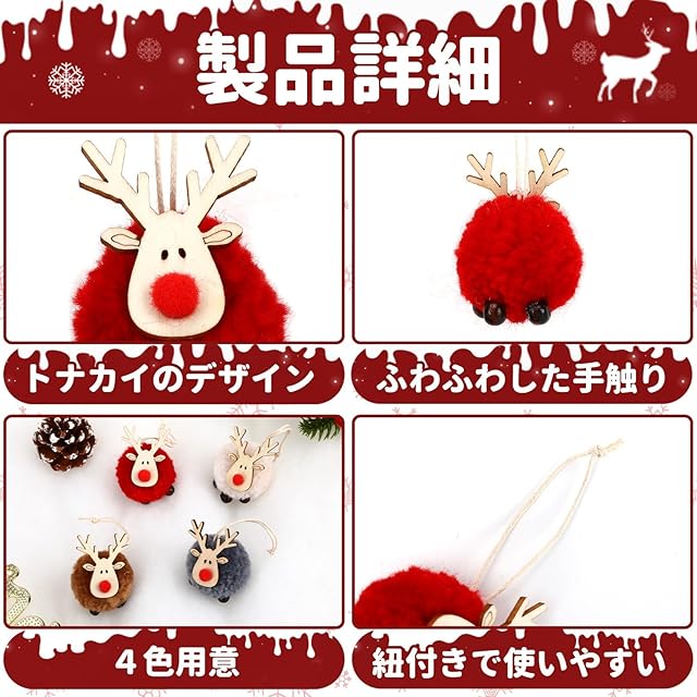 ふわふわとした手触り:クリスマスツリー飾りトナカイの布製の体部分は特殊加工が施され、表面はきめ細かくふわふわとしたフェルトで覆われます。柔らかくて滑らかな手触りで、雲に触れるような感覚で、心地よい感覚をもたらします。子供から大人まで、飾りや鑑賞の過程で、クリスマスの雰囲気を感じられます