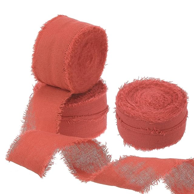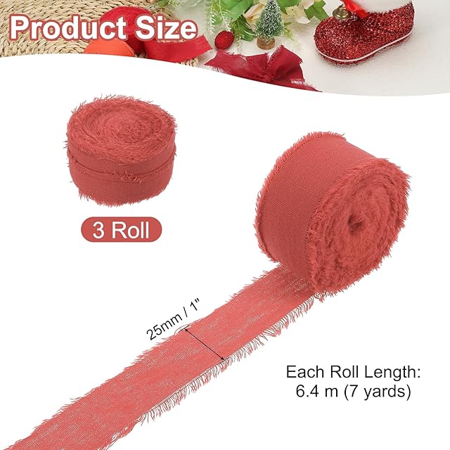 PATIKIL 1"×21ヤードの綿製手作りフリンジリボン 3ロールのほつれたフリンジリボン綿生地リボン 花束ギフト包装結婚式招待状用 ラストレッド