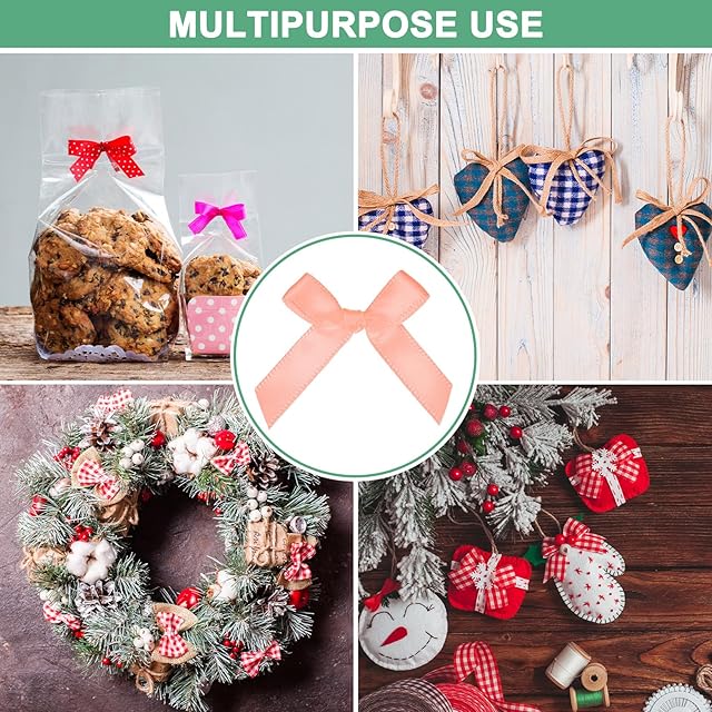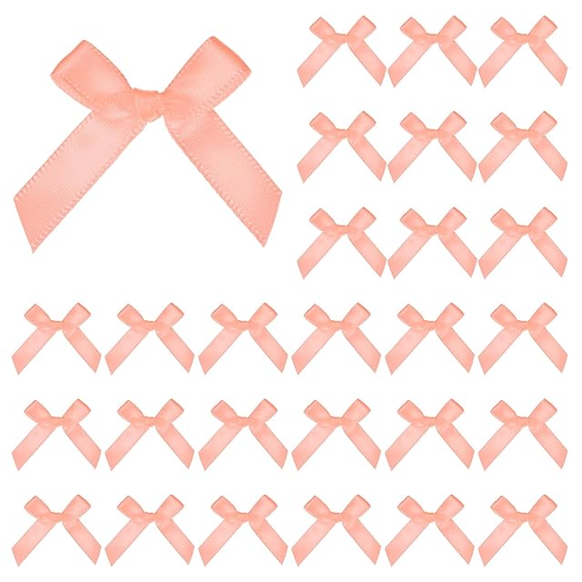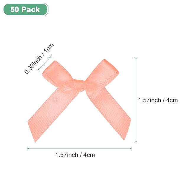 [サイズ&パッケージ] - 素材:ポリエステル;色:ライトオレンジ;全体サイズ:4 x 4 cm/1.57x1.57インチ(縦×横);リボン幅:1 cm/0.39インチ;パッケージに含まれるもの:50パック×ミニリボンボウ