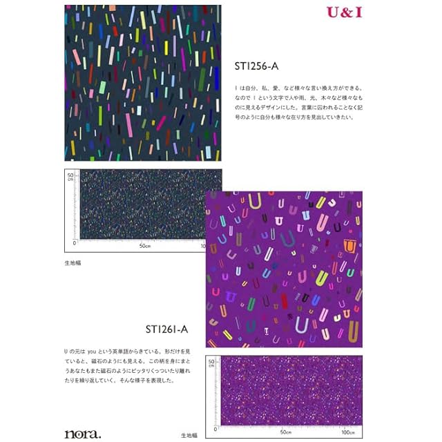 【U&I】<br> I は自分、私、愛、など様々な言い換え方ができる。<br> なので I という文字で人や雨、光、木々など様々なも<br> のに見えるデザインにした。言葉に囚われることなく記<br> 号のように自分も様々な在り方を見出していきたい。<br> <br> <br> 生地巾:110cm<br> 素材:綿100%<br> 生地種:20番手シーチング<br> 商用利用可<br>