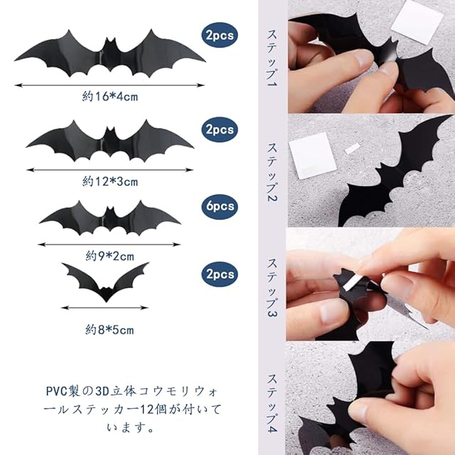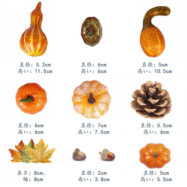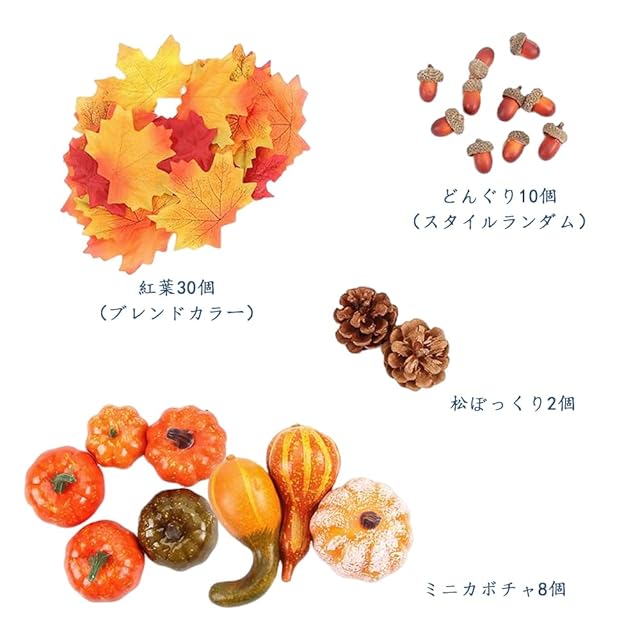50個のアイテムが含まれています。ミニカボチャ8個、どんぐり(スタイルランダム)10個、松ぼっくり2個、紅葉(ブレンドカラー)30個の組み合わせセットに、PVC製の3D立体コウモリウォールステッカー12個が付いています。